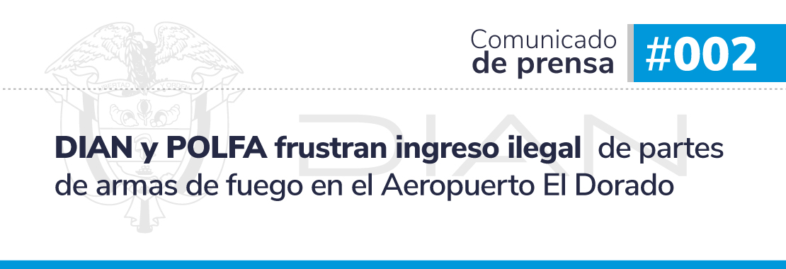 En cumplimiento de las funciones de control y fiscalización en el Aeropuerto El Dorado, la Dirección de Impuestos y Aduanas Nacionales (DIAN), durante un operativo conjunto con la Policía Fiscal y Aduanera (POLFA), logró interceptar un cargamento ilegal de partes de armas de fuego que pretendía ingresar al territorio nacional mediante la modalidad de tráfico postal y envíos urgentes.