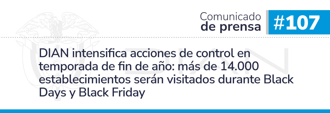 La Dirección de Impuestos y Aduanas Nacionales (DIAN) refuerza sus acciones de fiscalización durante la temporada de ventas de fin de año, incluidos los Black Days y el Black Friday. En esta ocasión, 3.500 funcionarios de la entidad visitarán más de 14.000 locales y establecimientos comerciales en diferentes ciudades del país, con el propósito de asegurar la correcta expedición de la factura electrónica y combatir prácticas que afectan el comercio formal.